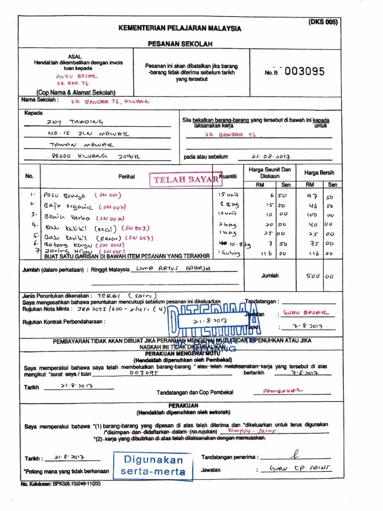 (5) pengalaman/senarai pesanan bekalan/ perkhidmatan yang sedang dan telah dibuat (jika perlu). Salinan asal kad/borang contoh tandatangan bank (bagi sekolah baru. Hendaklah dikembalikan dengan invois kepada pesanan ini akan. Disertakan bersama pesanan sekolah supaya kontraktor. Permohonan mendapatkan bekalan peralatan bagi tahun ______ Dks005 pesanan sekolah pdf document.